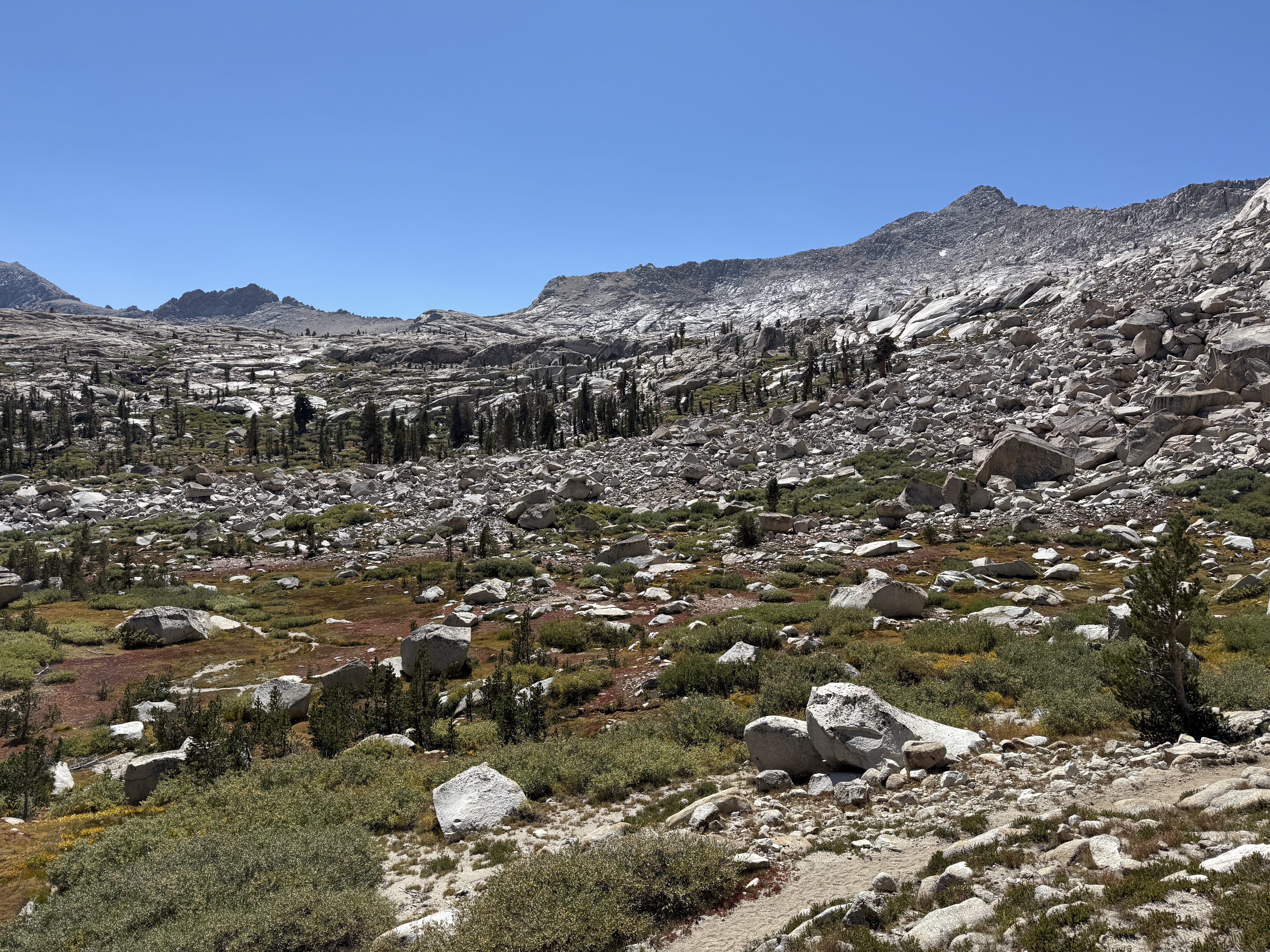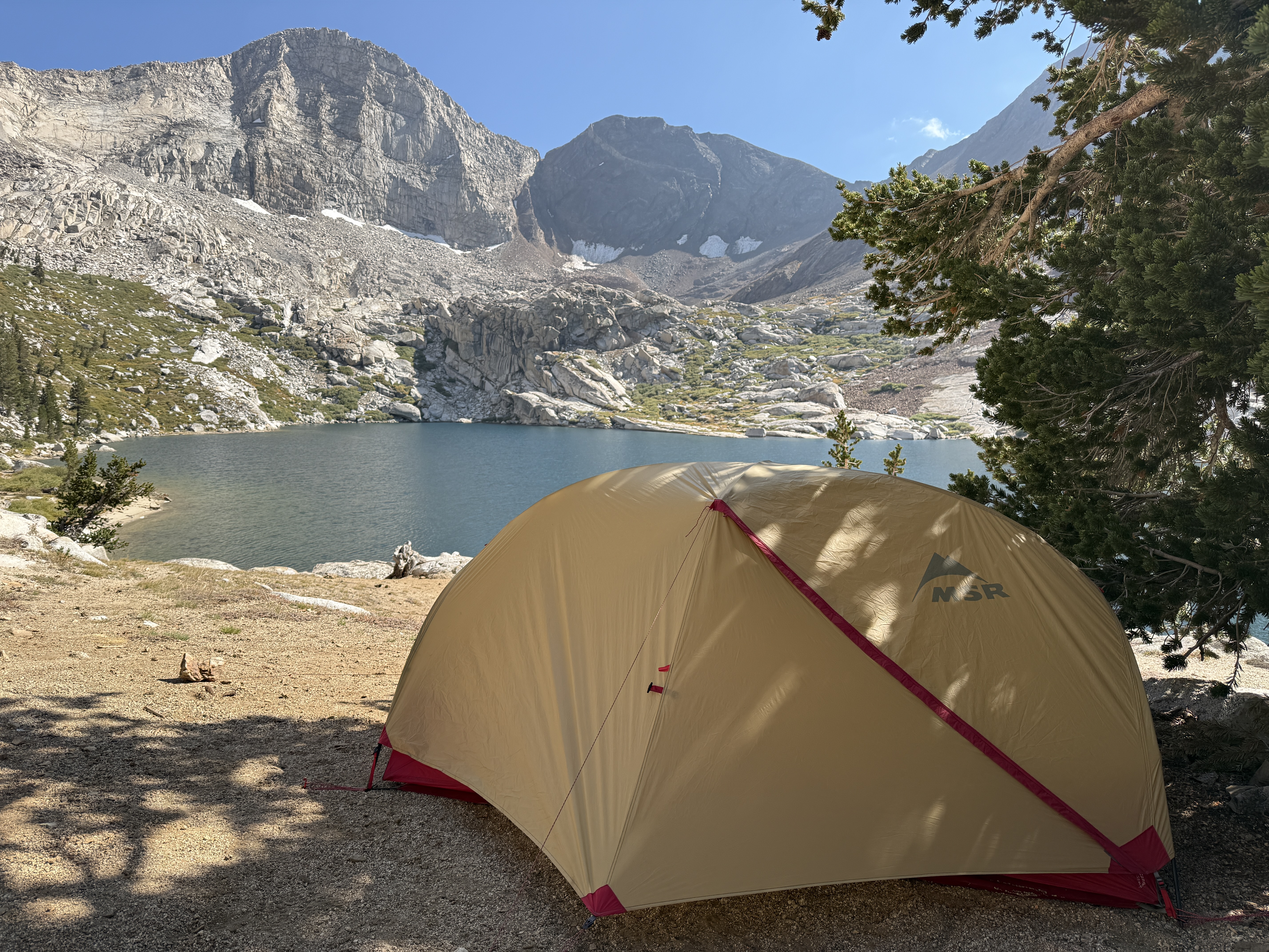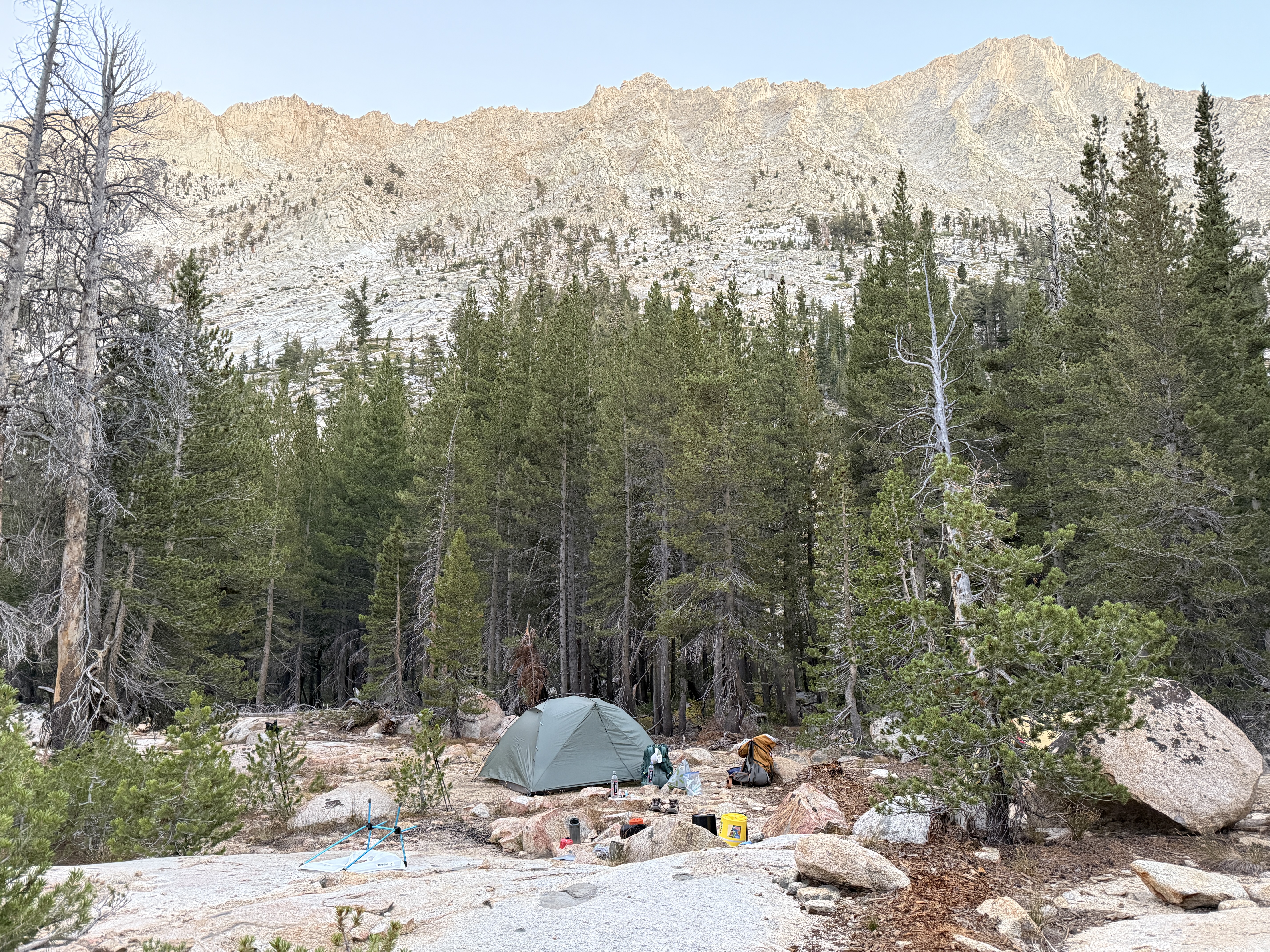 The rest of the day was spent following Soda Creek as it gently descended down a lovely canyon. At this point, it was clear that we had perhaps lingered a little too long on Franklin Pass, and it wasn’t realistic for us to make it to our intended campsite around the next trail junction before nightfall. Not wanting to hike through the night, we began looking for a suitable spot to set up camp as it grew closer to sunset. We ended up finding a decent spot in a rocky area of the canyon, with the only downside being slightly difficult access to the creek to filter water. Well, that and what appeared to be an anthill—or worse, a wasp nest—nearby, though fortunately it looked like nobody was home. But I won’t complain: it was a beautiful campsite, and before heading to bed we got to admire the alpenglow atop Mount Whitney in the distance.8 I regret not taking a picture, but I think Ricky got one.