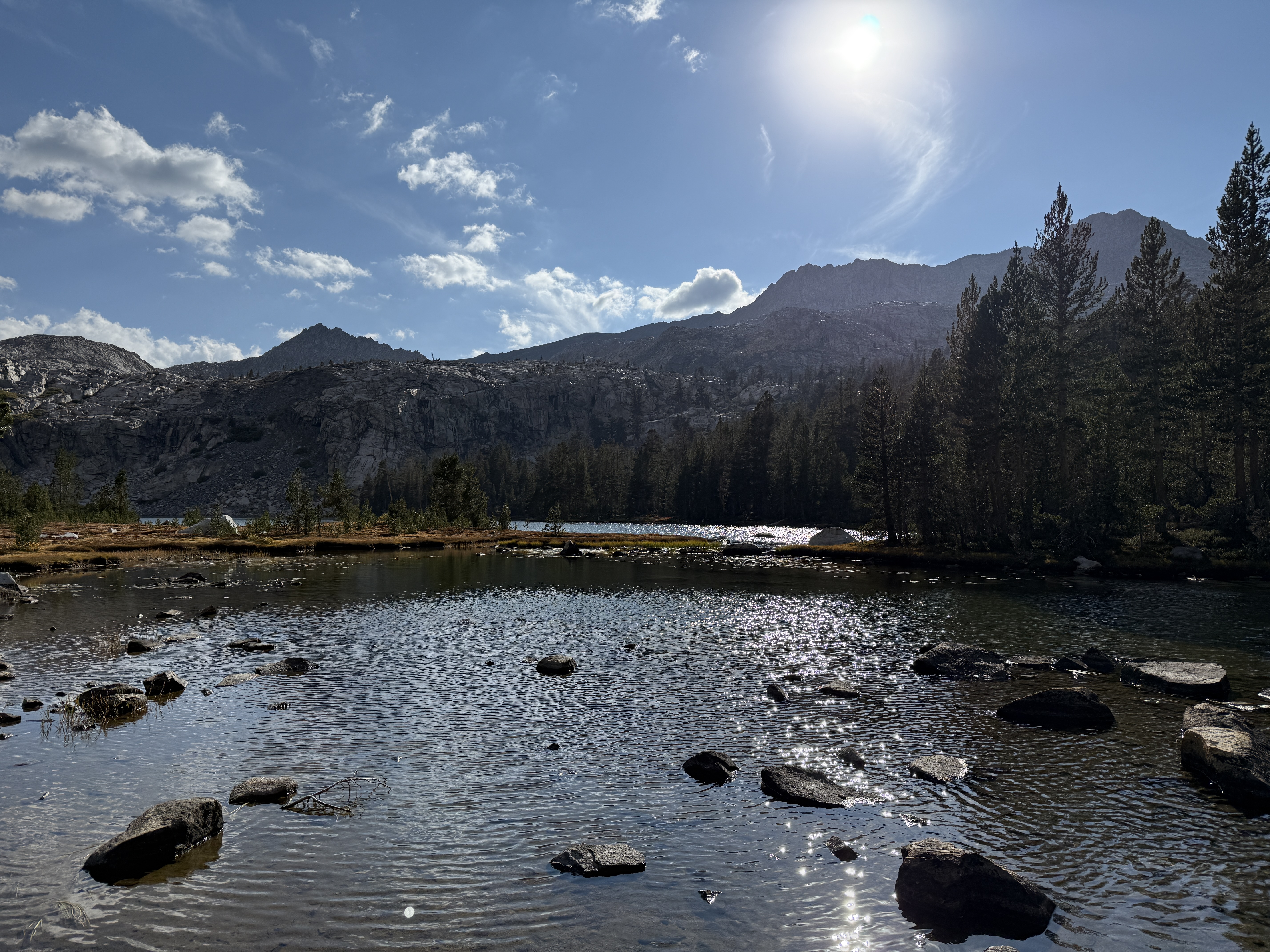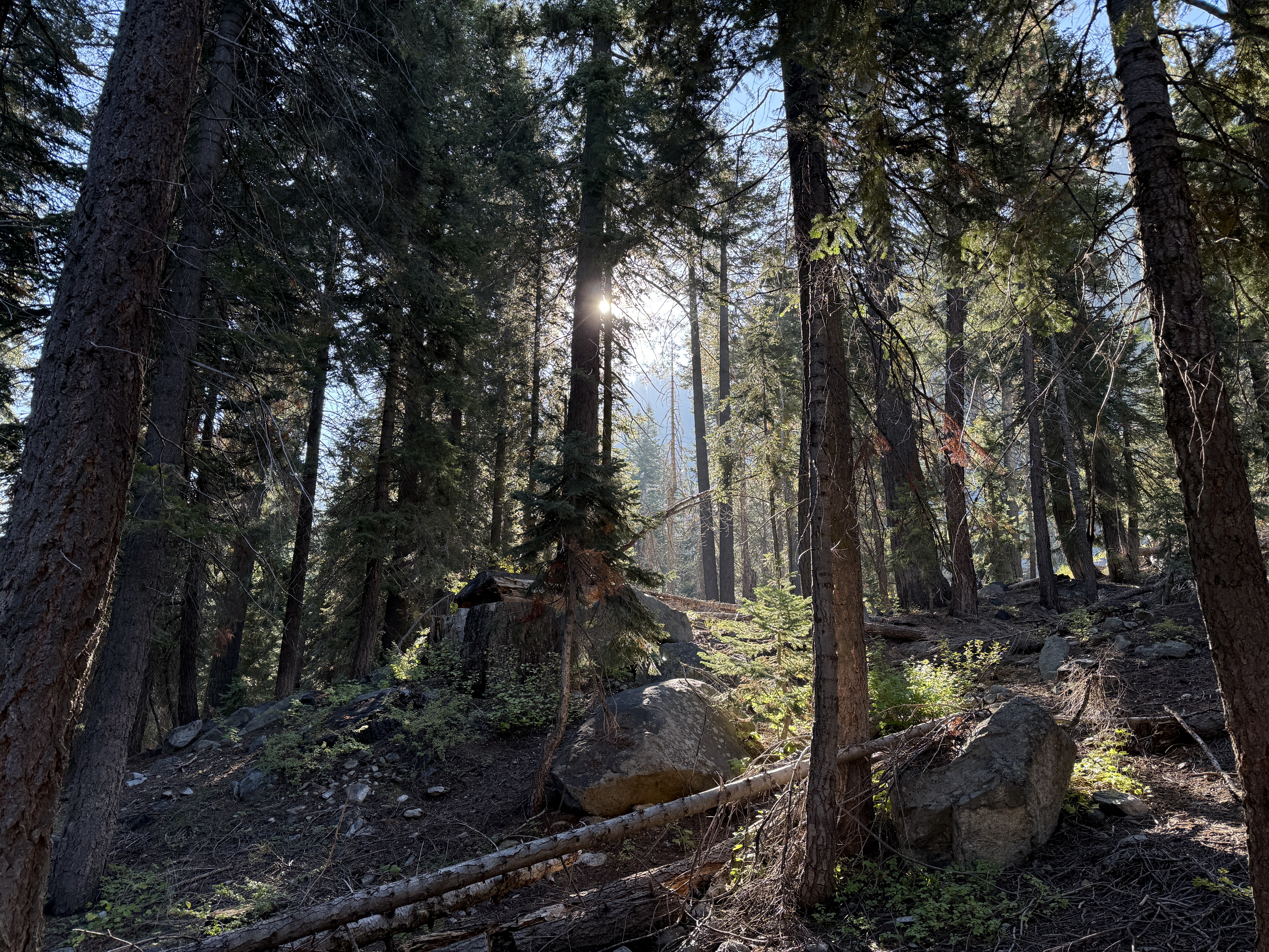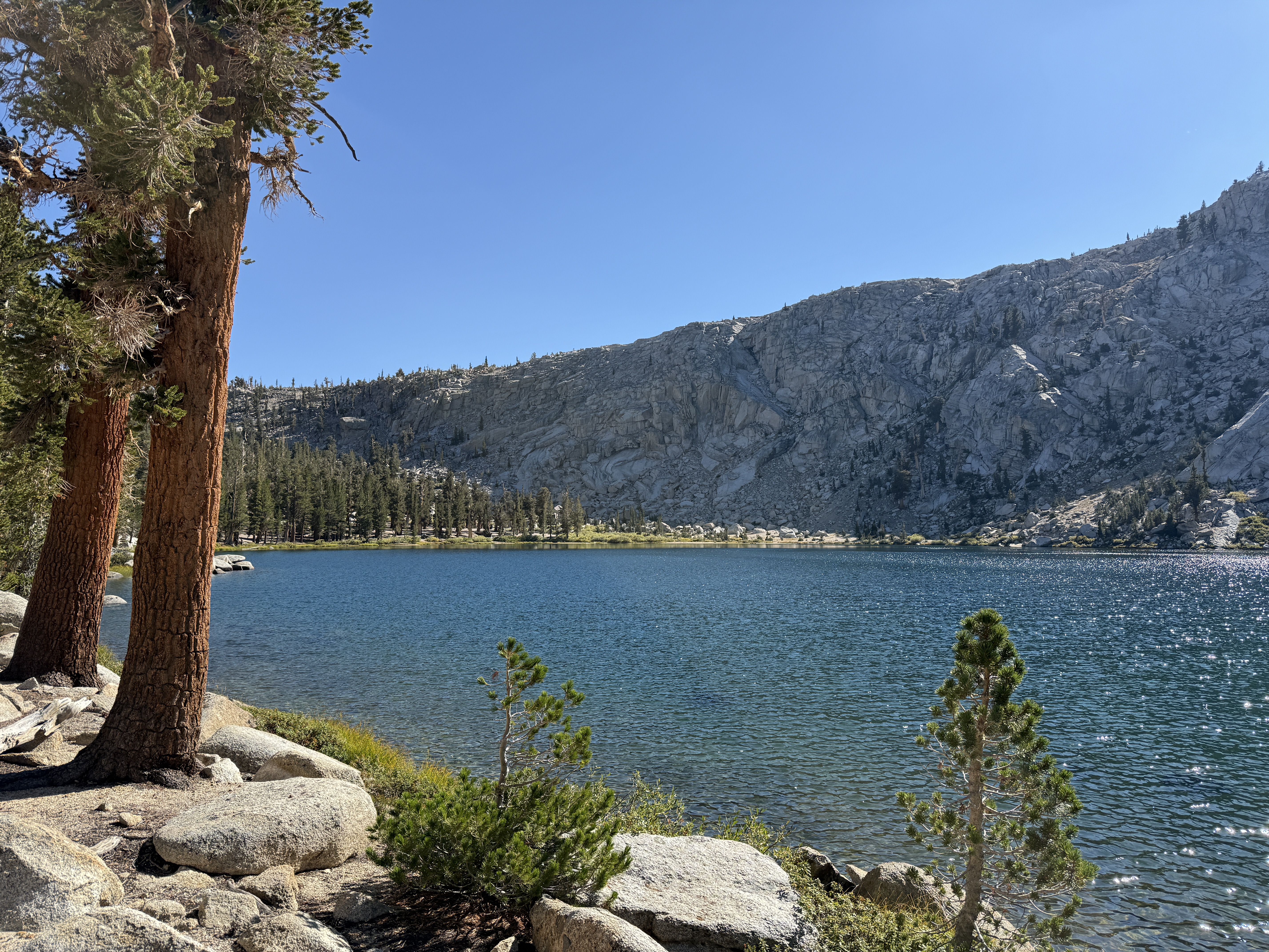 The rest of the day was spent following Soda Creek as it gently descended down a lovely canyon. At this point, it was clear that we had perhaps lingered a little too long on Franklin Pass, and it wasn’t realistic for us to make it to our intended campsite around the next trail junction before nightfall. Not wanting to hike through the night, we began looking for a suitable spot to set up camp as it grew closer to sunset. We ended up finding a decent spot in a rocky area of the canyon, with the only downside being slightly difficult access to the creek to filter water. Well, that and what appeared to be an anthill—or worse, a wasp nest—nearby, though fortunately it looked like nobody was home. But I won’t complain: it was a beautiful campsite, and before heading to bed we got to admire the alpenglow atop Mount Whitney in the distance.8 I regret not taking a picture, but I think Ricky got one.