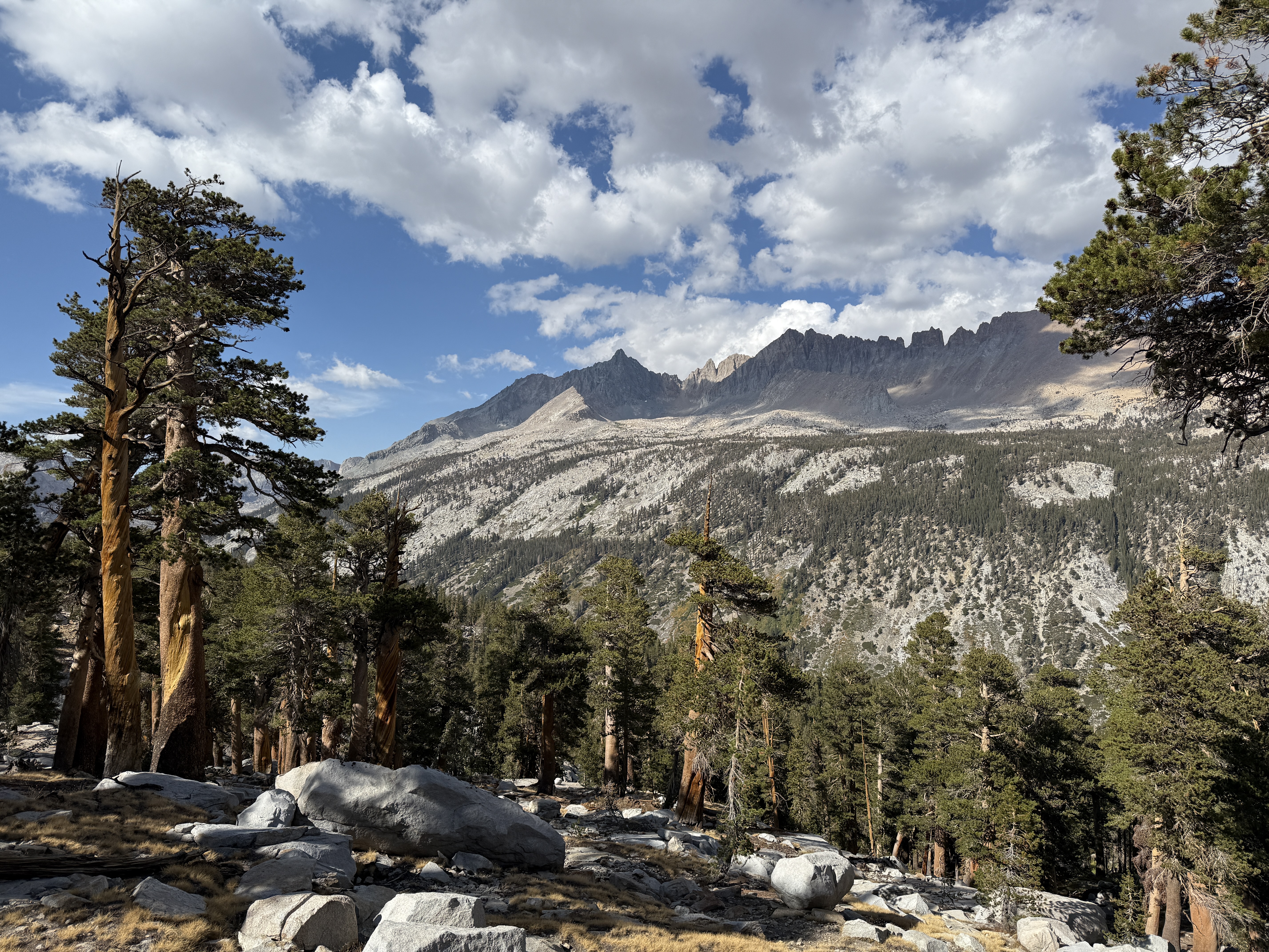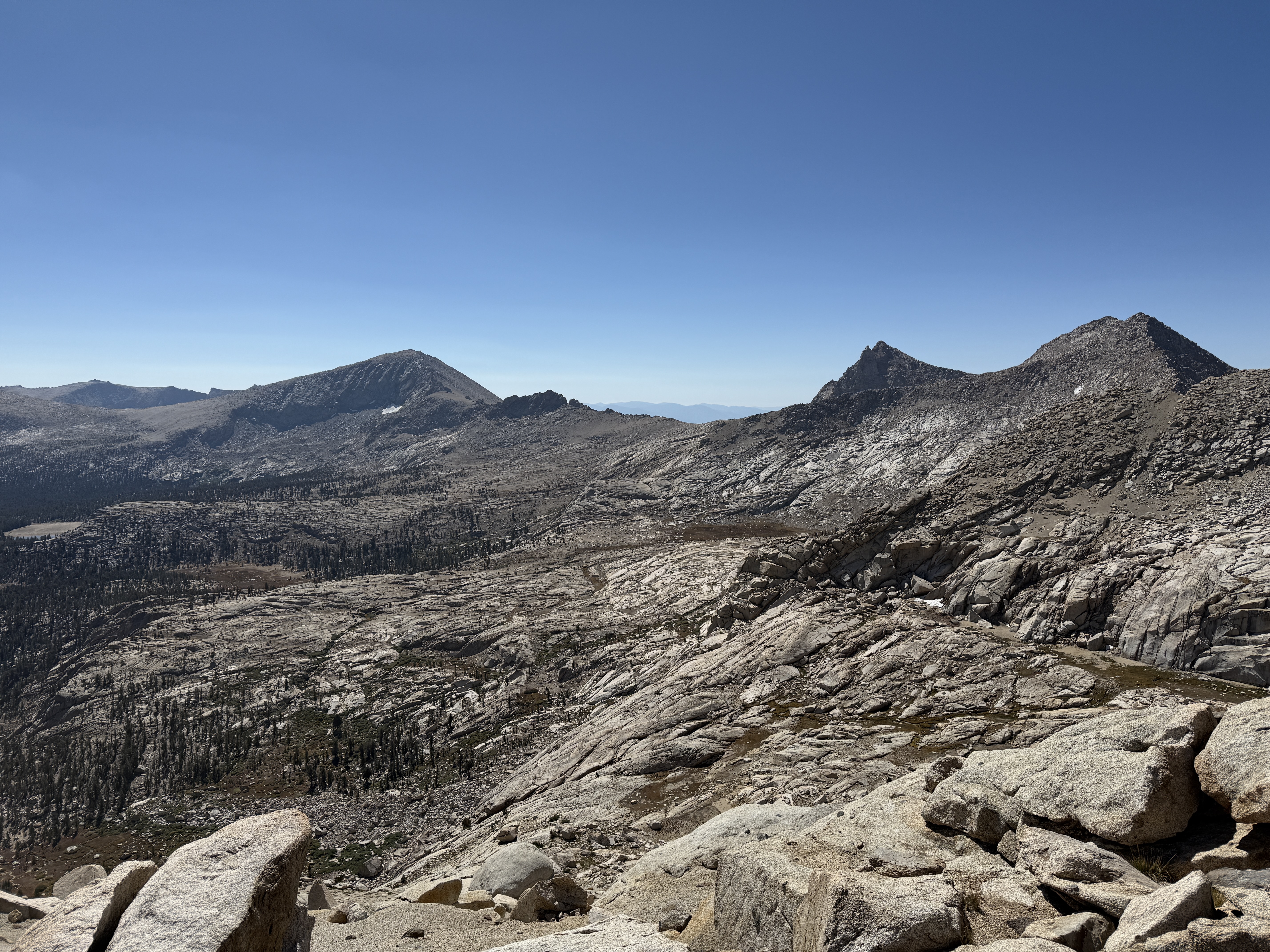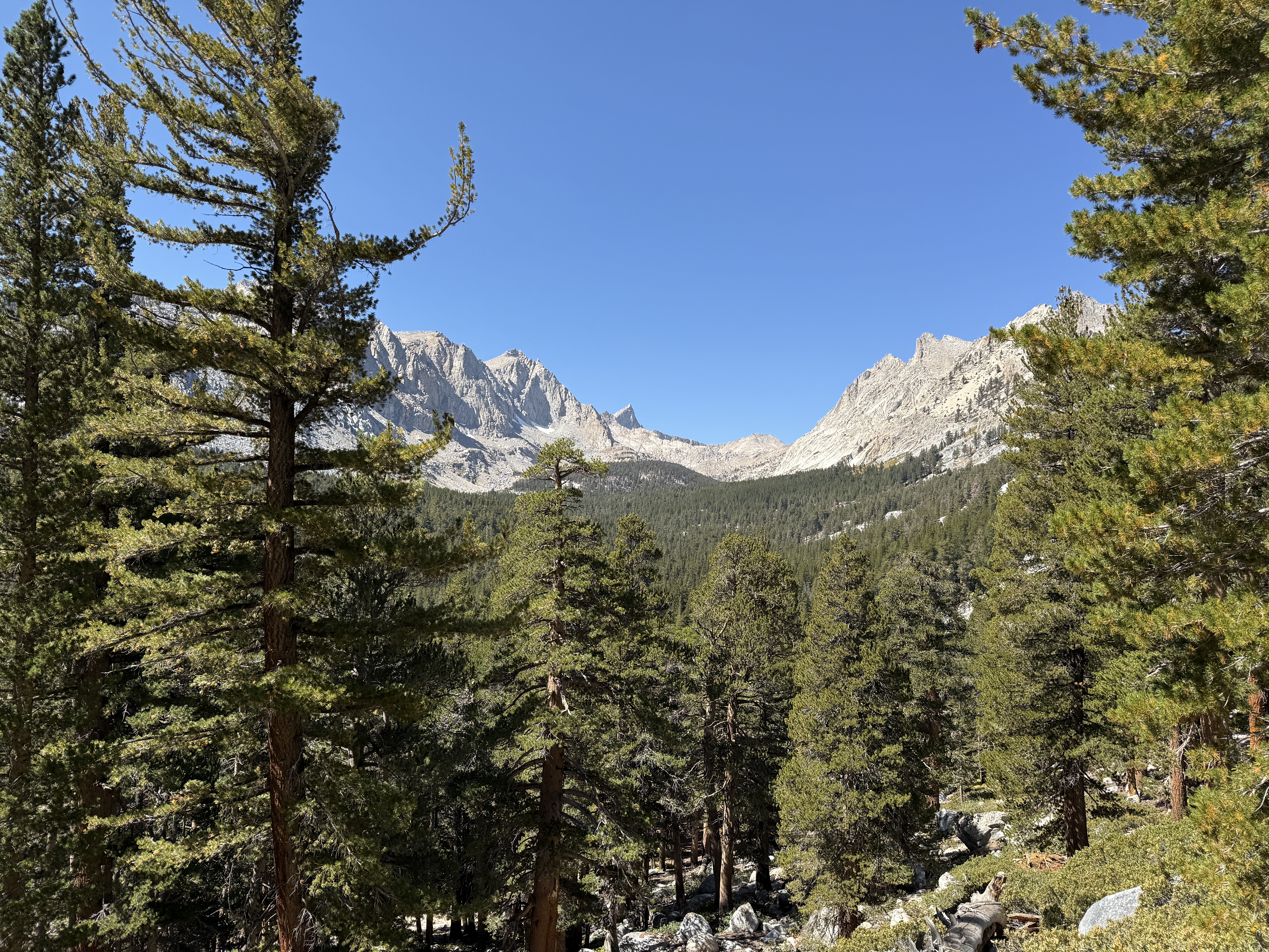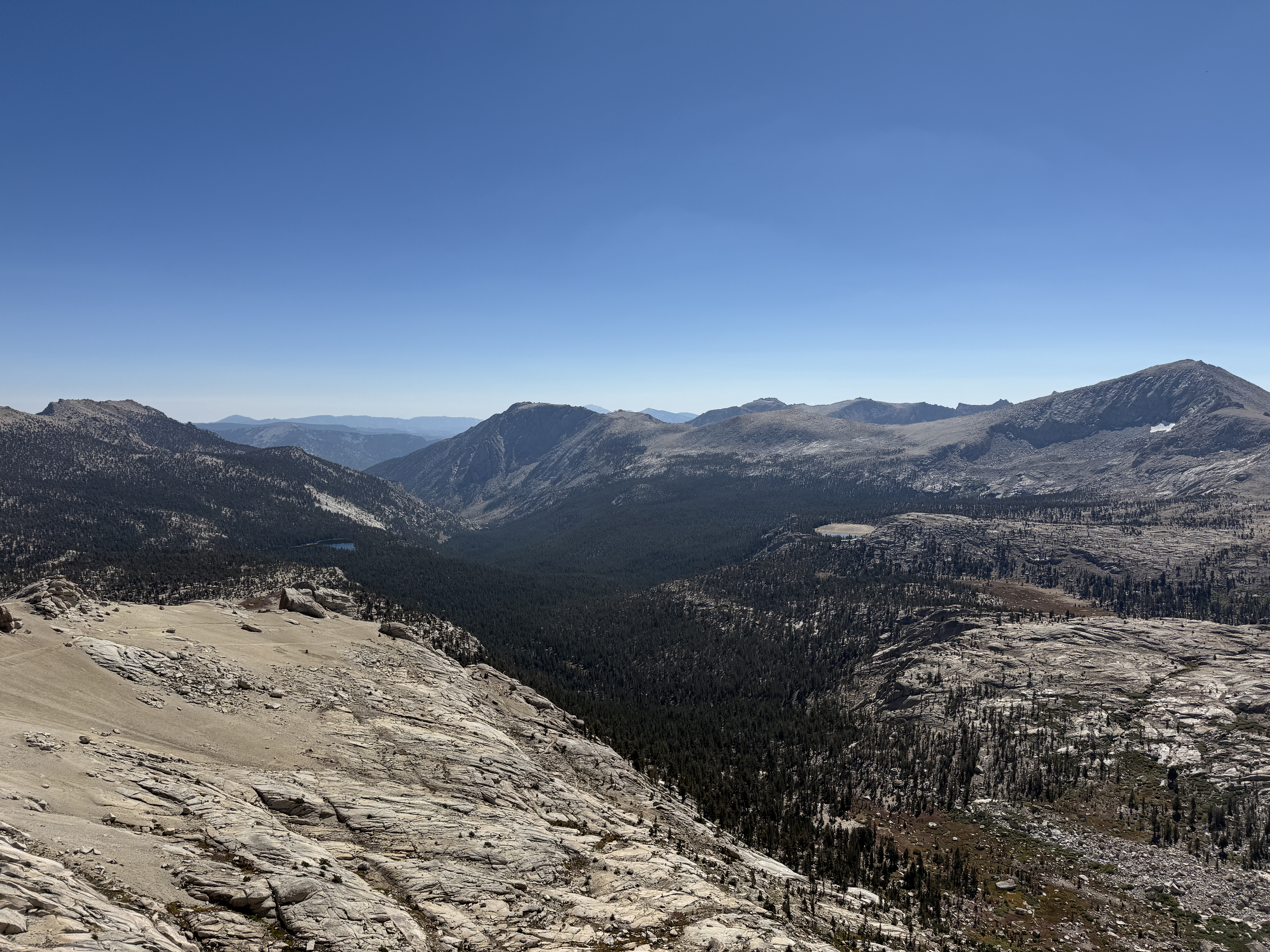 Eventually, the trees began to thin out, and we entered some really beautiful, rocky terrain. We went at a fairly easy pace and took plenty of breaks; each break was also an opportunity to look back and enjoy the view of the valley stretched out below us. To the north, we could see the other high peaks of the Sierra Nevada, although for some reason the air looked faintly hazy in that direction. My guess is that it was due to the wildfire smoke, but I’m not entirely sure.
