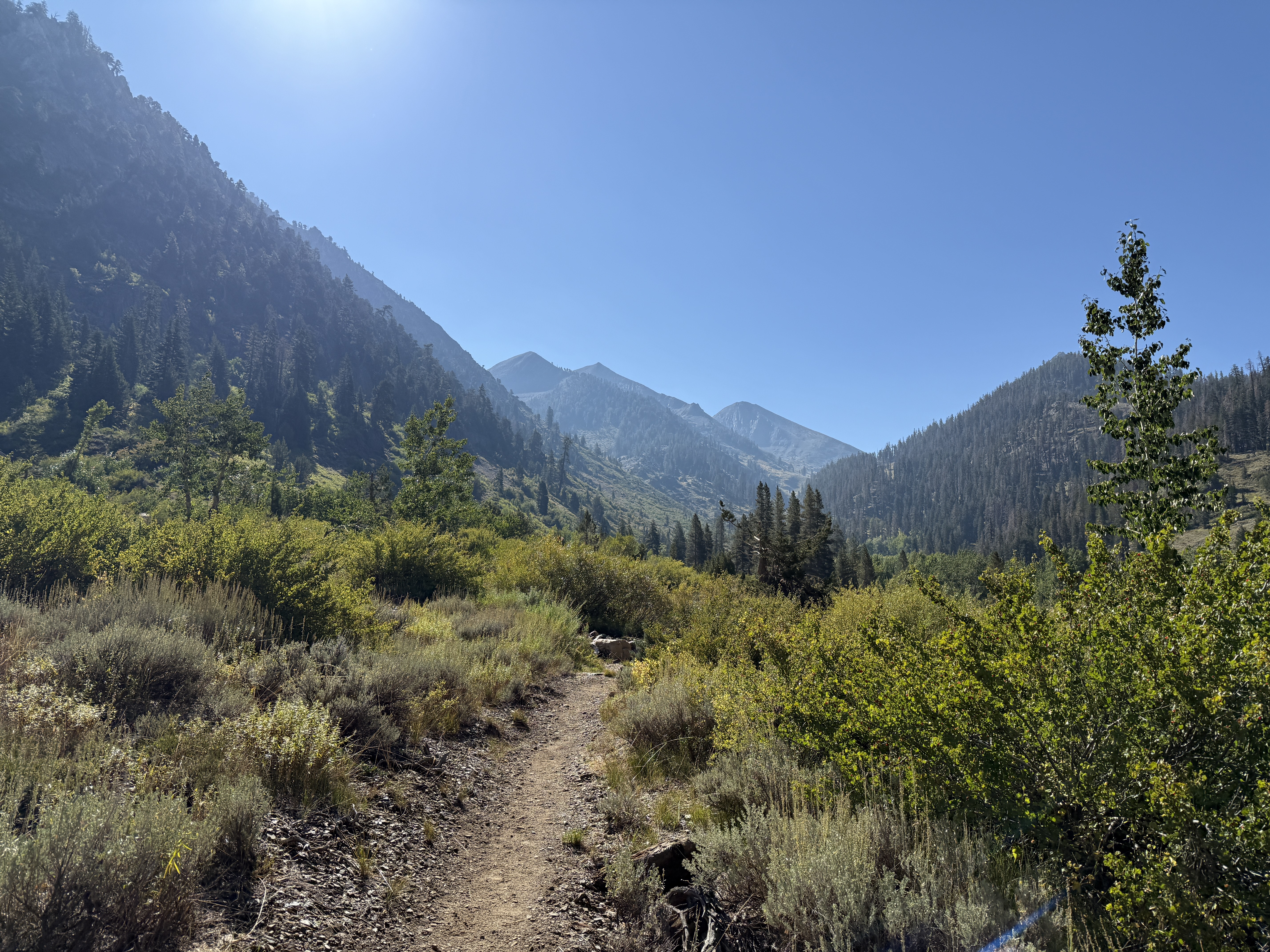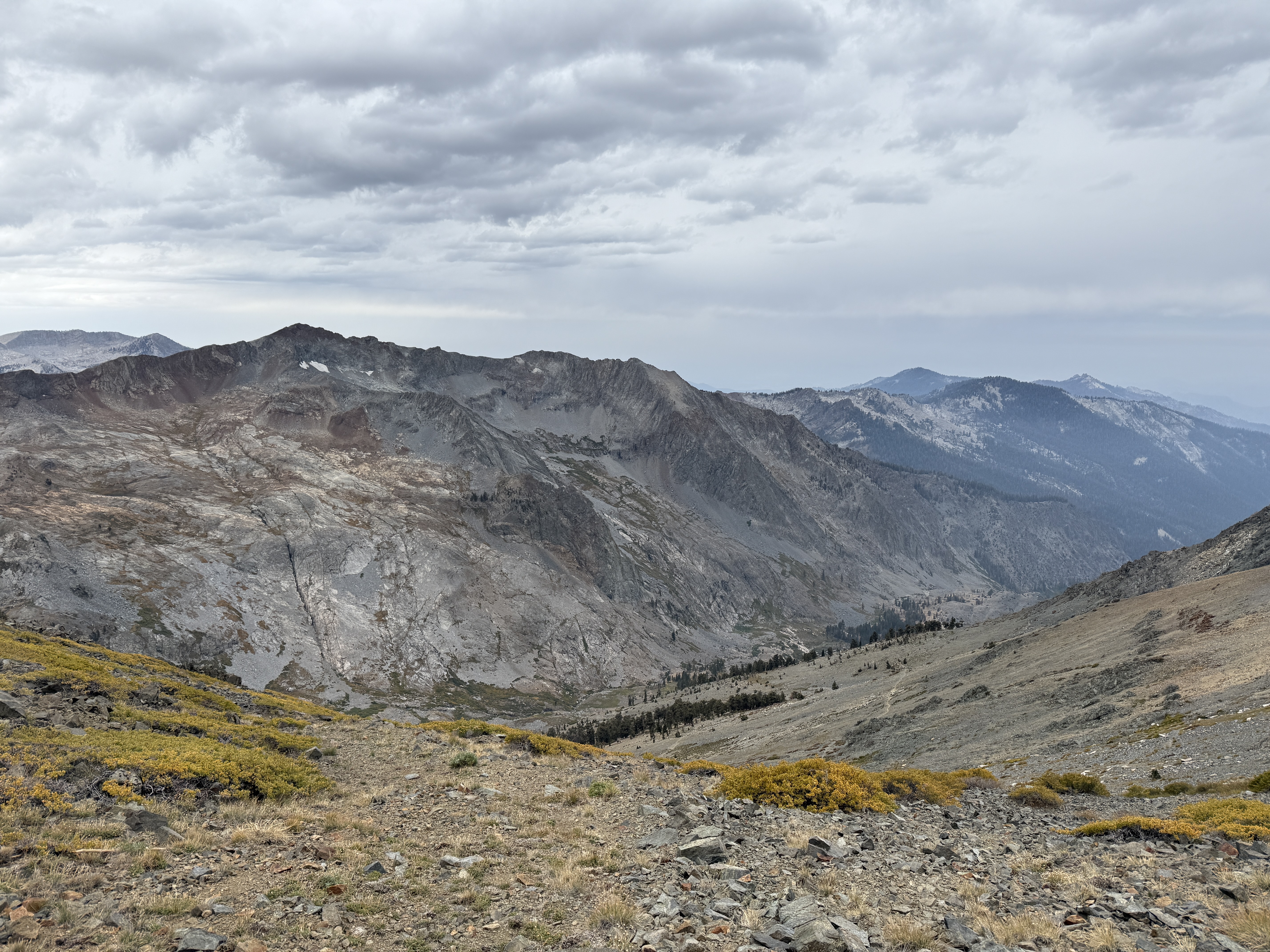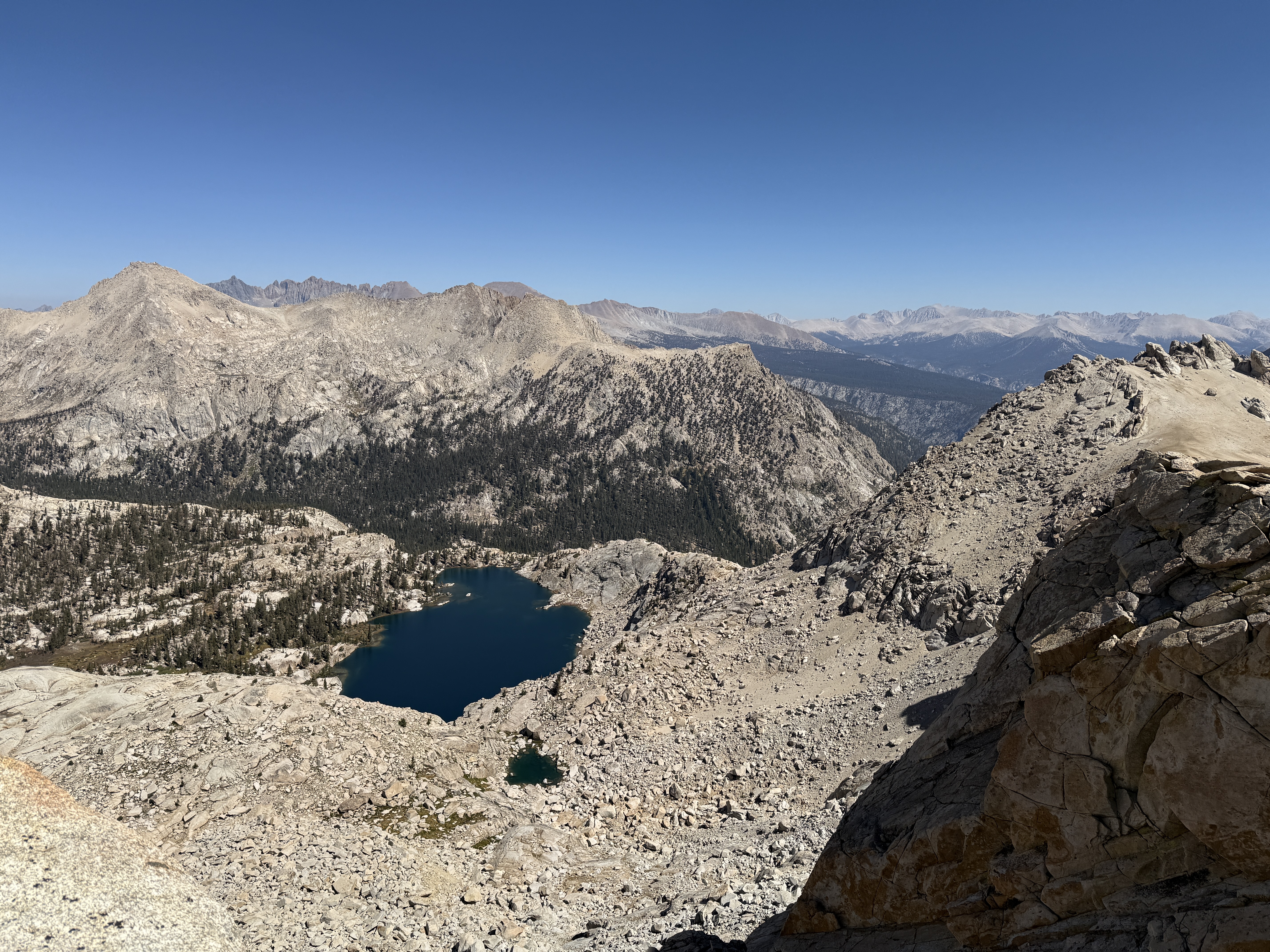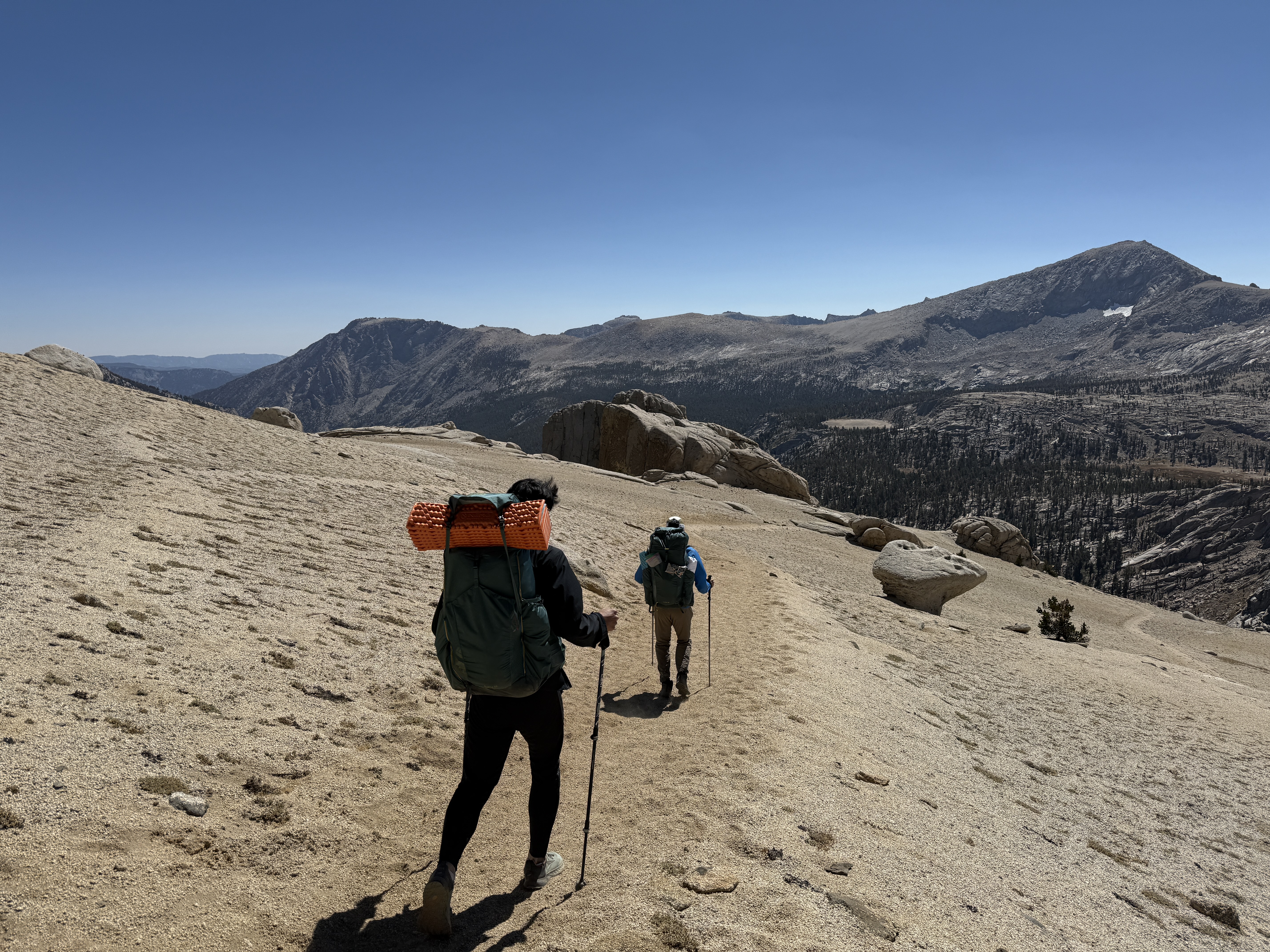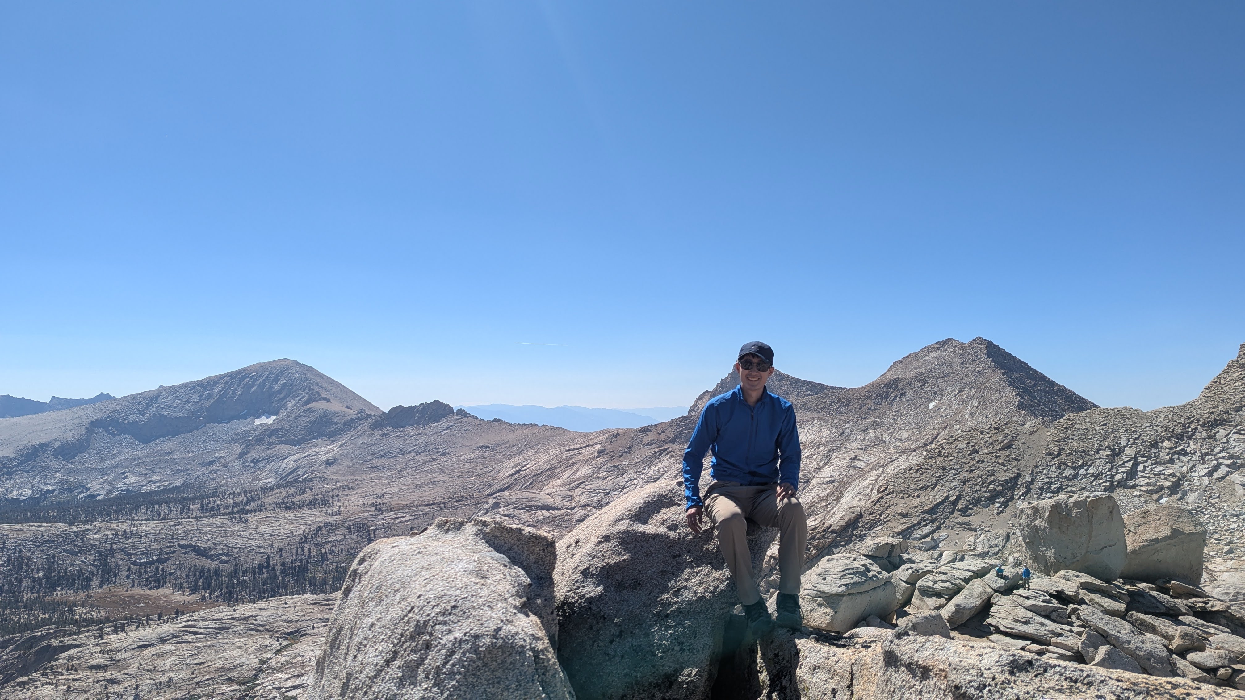 Eventually, the trees began to thin out, and we entered some really beautiful, rocky terrain. We went at a fairly easy pace and took plenty of breaks; each break was also an opportunity to look back and enjoy the view of the valley stretched out below us. To the north, we could see the other high peaks of the Sierra Nevada, although for some reason the air looked faintly hazy in that direction. My guess is that it was due to the wildfire smoke, but I’m not entirely sure.