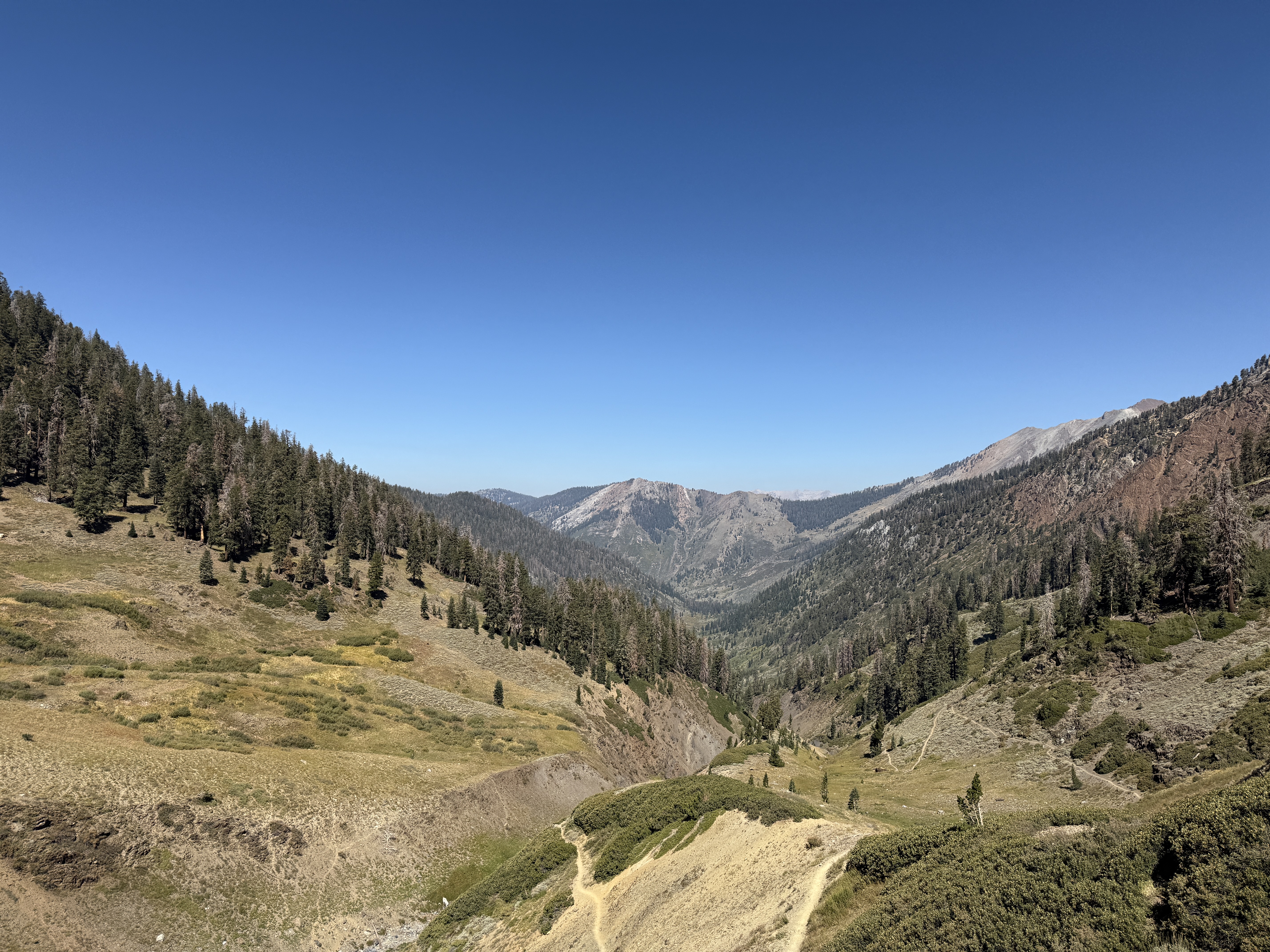 The trail started out fairly mellow, following a stream that gradually climbed out of the Farewell Canyon. Being still at comparatively lower elevation, the landscape was still dominated by yellow grass, a classic summertime sight in California. We passed a couple of parties on the initial climb, as well as a stable of horses in the valley, which would turn out to be foreshadowing for the occasional patch of manure that we’d later encounter on the trail.