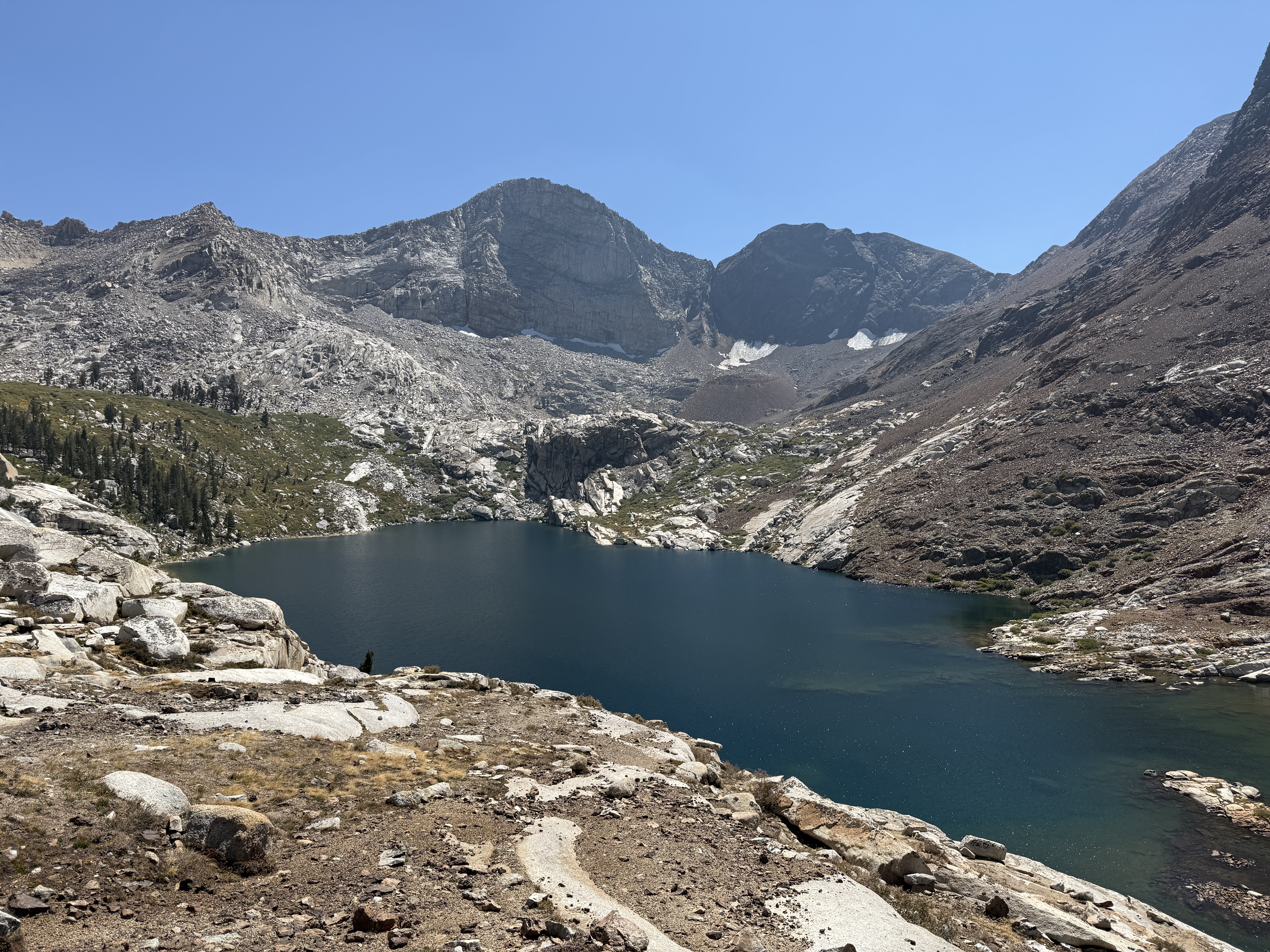 Although the views from the top of the pass were pretty spectacular, we didn’t linger very long because the wind was picking up, making it a bit unpleasant to stay at the exposed crest. We began the descent westward into the valley below—a slightly intimidating descent, for according to the map, we were to spend the rest of the day going straight downhill for about five thousand feet. The early part of the descent was quite beautiful; once we got a little further down the mountain, we had an incredible glimpse of Sawtooth Peak to the left, with not one, not two, but three alpine lakes nestled among the granite walls: Columbine, Cyclamen, and Spring Lakes. Though it was an incredibly beautiful sight, it also made me a little bit sad knowing that this was to be our last view of the mountains: the rest of the hike was to be spent at lower elevation, mostly among pine forests.