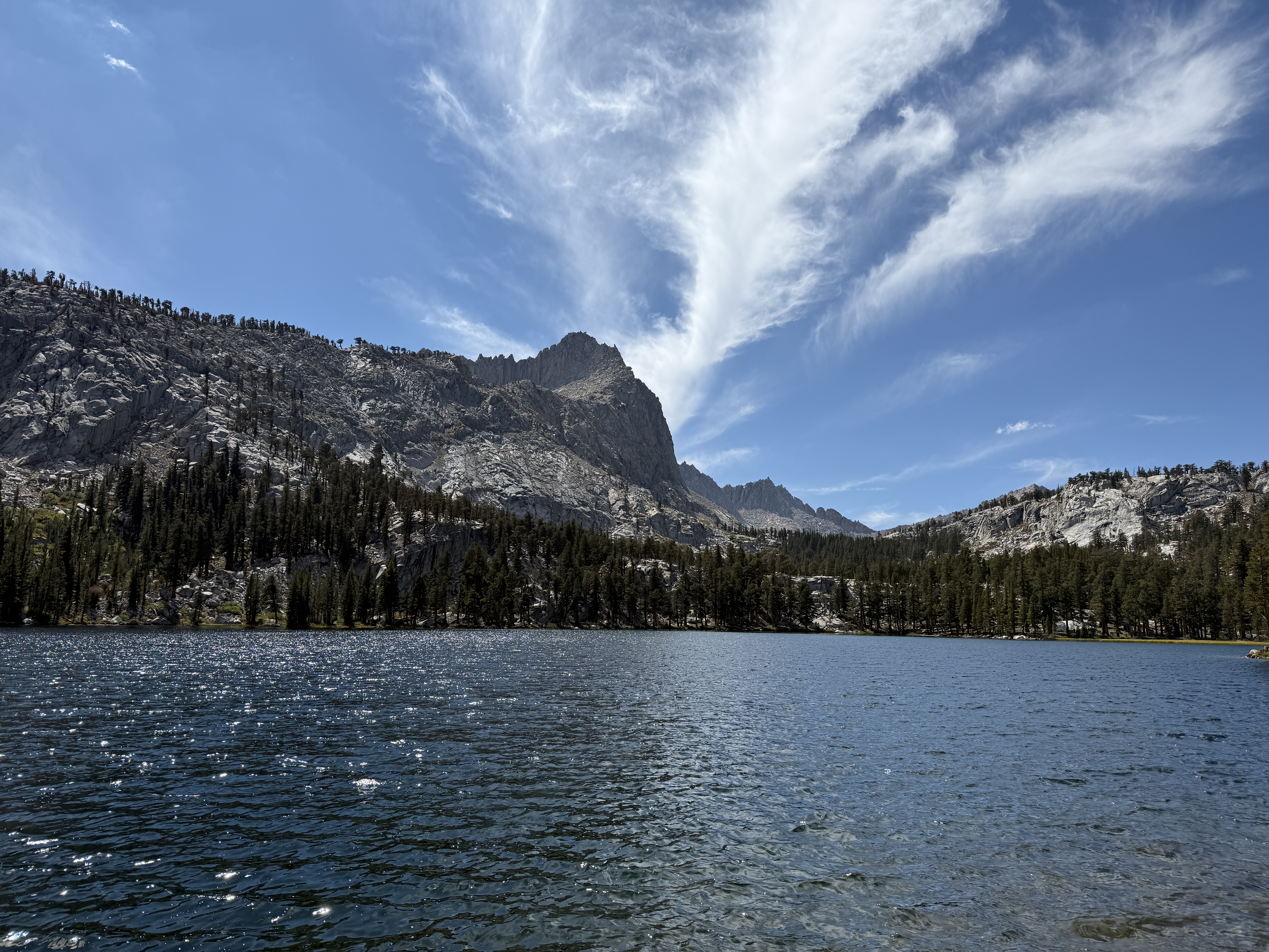 We stopped for lunch at Forester Lake before continuing on to a brief climb then a descent past Little Claire Lake. Here, we hit a really scenic section of the trail, with great views of Sawtooth Peak and Needham Mountain to the northwest, and Mount Whitney to the northeast. The tall trees obscured much of the view, but every once in a while there’d be a gap in the trees, and we’d catch a glimpse of the spectacular mountains of the Mineral King area and beyond.