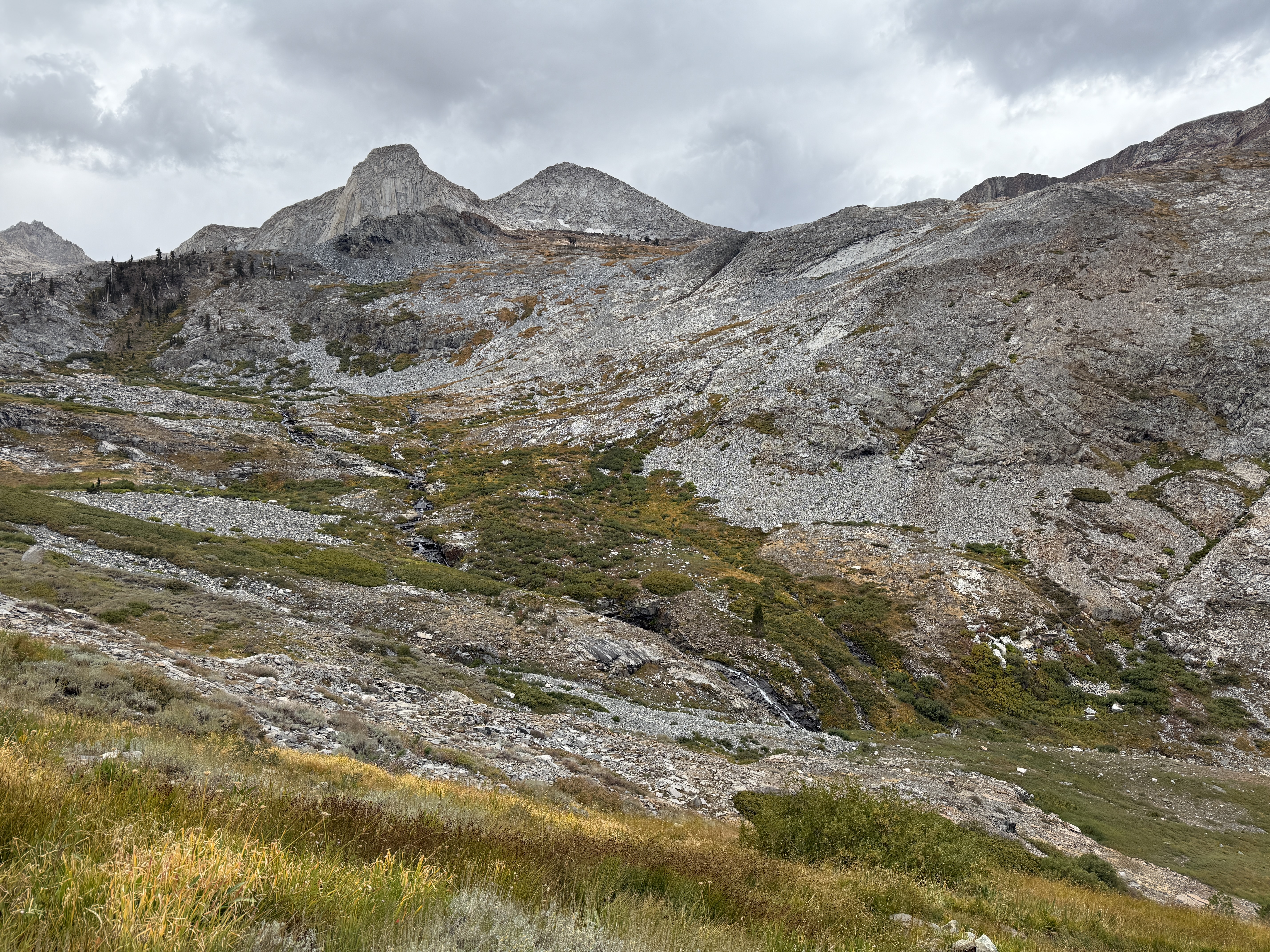After a bit of a sad lunch consisting of the remainder of our tortillas and pistachio butter, we continued the hike down the valley, encountering some on-and-off precipitation. As we got lower in elevation, the trail became a lot more lush, with the trail somewhat overgrown at times. This was quite annoying, both because of the occasional thorn bush and because it was impossible to avoid brushing against the dense vegetation, which was really wet because of the rain. Ray bravely led the way in this section, leading to his pants getting completely soaked.
