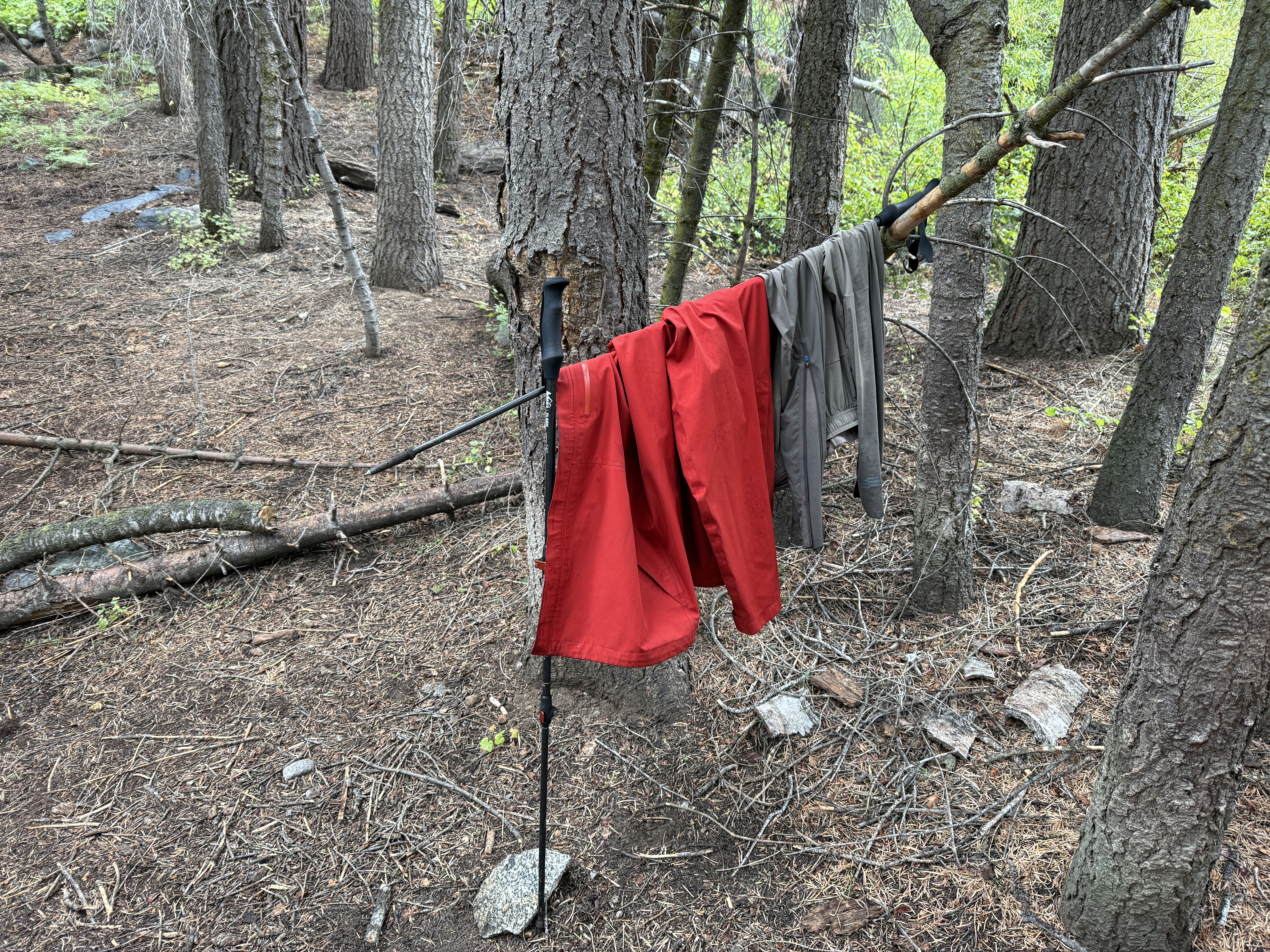 With our gear all wet from the rain, we came up with increasingly ingenious ways to dry our clothing off. I was quite proud of my first contraption: I propped up my trekking poles against a tree to create a drying rack on which we hung a jacket and a wet pair of pants. Then, after gathering dry firewood and starting the campfire, I propped up a stick against a log to form a drying rack for my socks over the fire. Finally, I remembered that I had some paracord in my pack, so I strung some up between two trees near the fire to hand more clothes to dry. Really, they should give me an honorary doctorate in civil engineering or something to celebrate my amazing accomplishments.