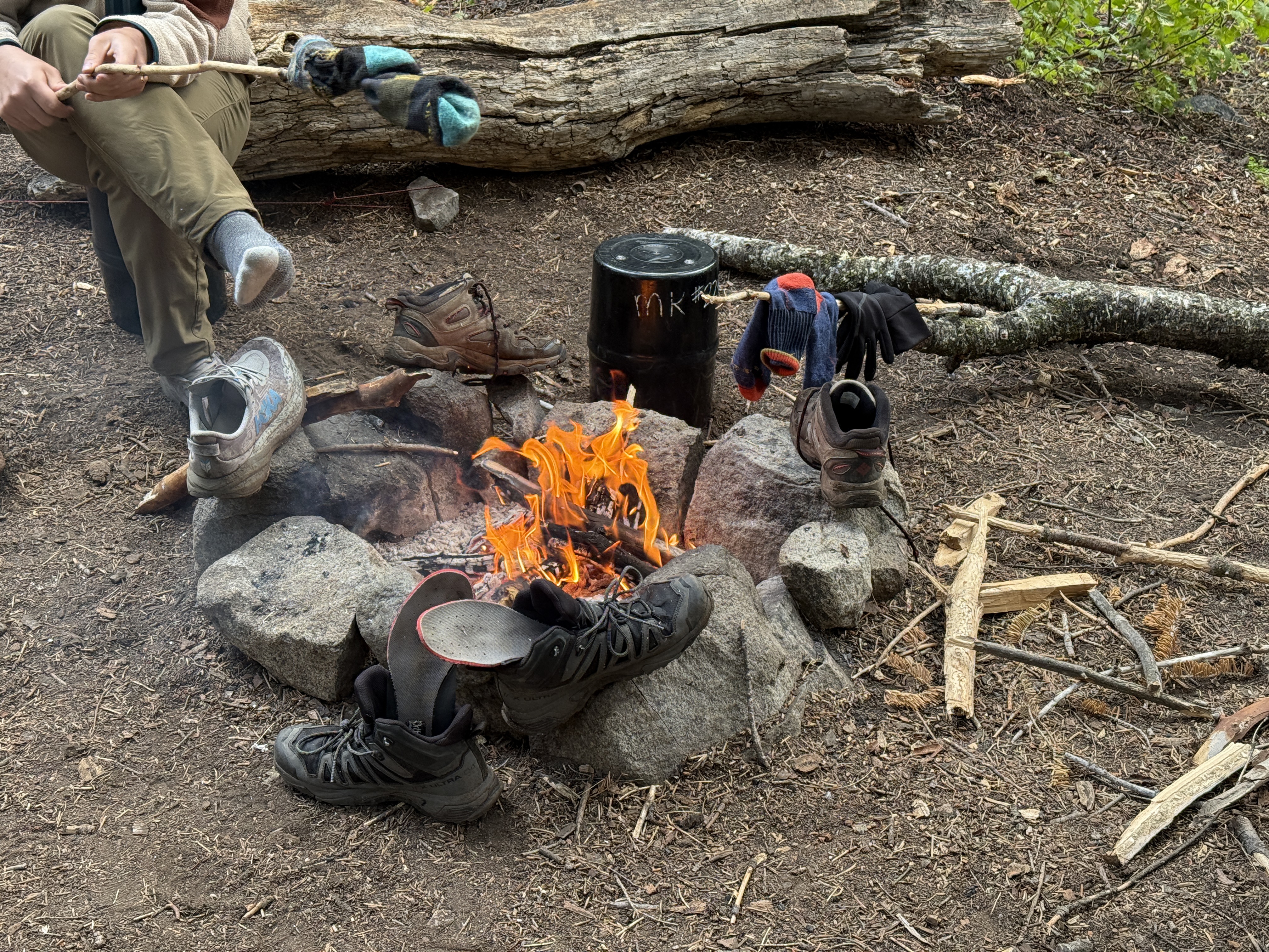 We were much cheered when we finally arrived at our campsite, situated at the junction of Cliff Creek and Timber Gap Creek. It really was a wonderful campsite: earlier, we had been a bit concerned about water availability because we had hiked along a dry creek bed for a bit, but this fear turned out to be entirely unfounded. The creek was flowing quite well, the access to the water from the campsite was very easy, and the water was clear and fast-moving to boot. We also had a bear box at this campsite, and we were fortunate to be under the shelter of several tall trees, such that the ground was actually entirely dry in some places despite the on-and-off rain throughout the day.11 But best of all: we were at an elevation low enough that we were allowed to have a campfire! There are very few things in life more fun than sitting around a campfire after a long, wet day of hiking, especially when someone in your group had the foresight to pack hot chocolate.12