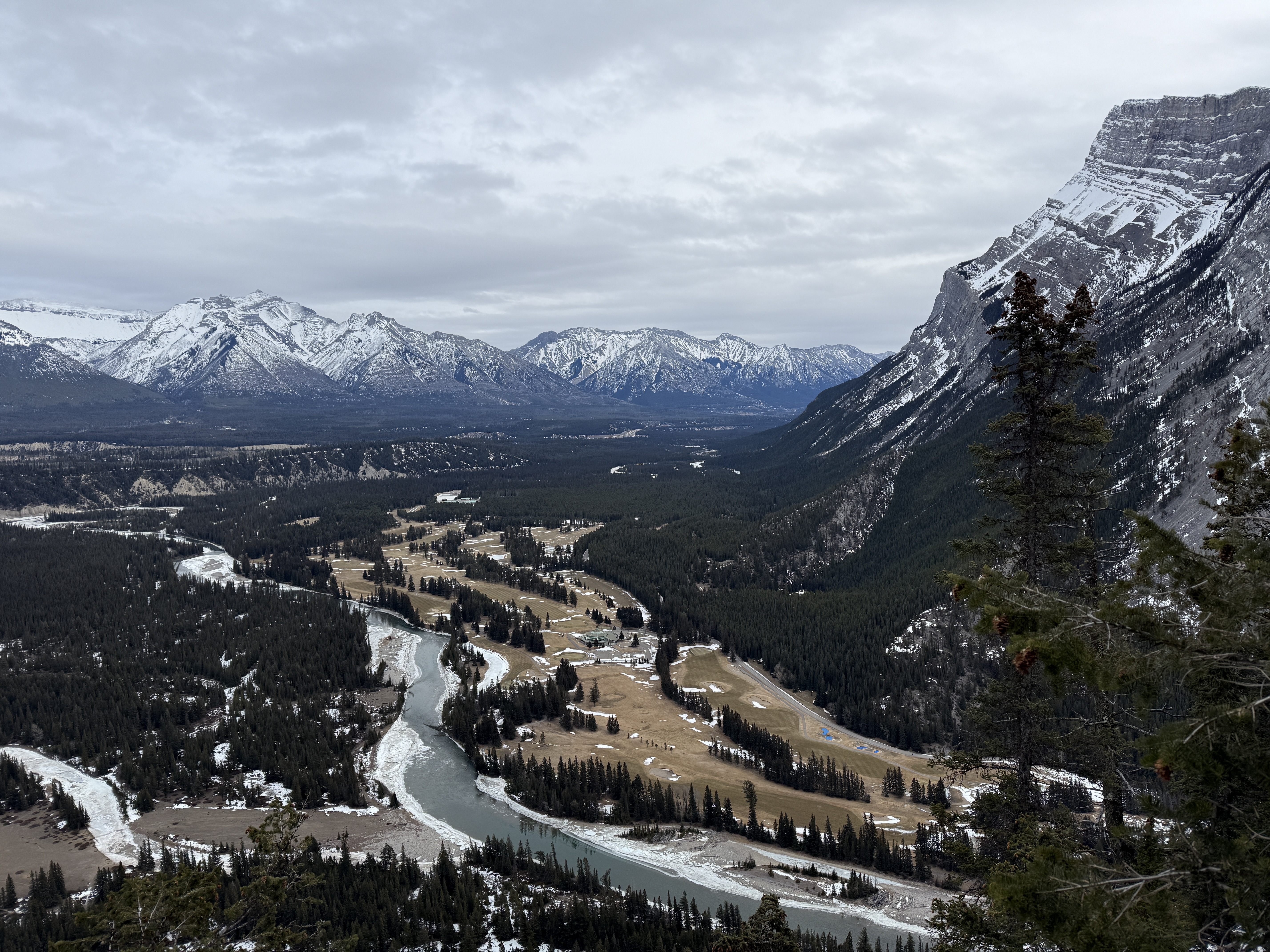 We also did a short winter hike up Tunnel Mountain on the advice of Jerry, who had previously done this hike before. The trail was fairly icy, so we rented ice cleats at a local shop. This was my first time hiking with ice cleats; I was honestly a little disappointed. I had thought that they would make me invincible on the ice, but it turns out that ice is actually still kind of slippery, even with traction devices. Anyway, the summit was quite nice, and we took a little side trail to a spectacular viewpoint of Mount Rundle. Ray and I got a little lost on the way back, but this turned out to be a good thing, because we met a friendly deer off the side of the trail.