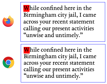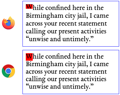 </p>Now if we apply the CSS rules to the ::first-letter, we get the same results as last time. But Firefox actually changes its mind to agree with Chrome if we apply it instead to the span element. If you squint, there are still some slight differences between the two browsers; I’ve blown up the font size to 500% so that you can see the differences more clearly: